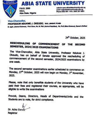 The Management of Abia State University urged students to utilize the extra week wisely by engaging in intensive revision, group discussions, and consultations with lecturers where necessary. The circular emphasized the institution’s zero tolerance for examination malpractice, warning that any student found guilty of misconduct during the examinations will face disciplinary action in accordance with the university’s regulations.