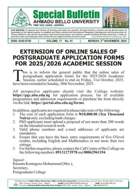 The Ahmadu Bello University School of Postgraduate Studies (SPGS) has extended the closing date for the sale of postgraduate application forms from the earlier date of Friday, October 31, 2025, to a new deadline of Sunday, November 30, 2025.