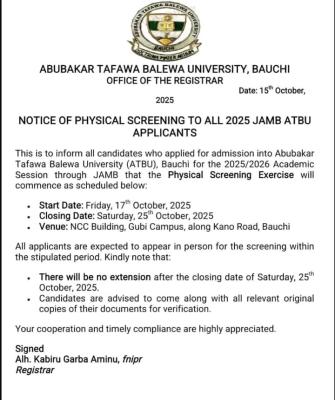 The management of Abubakar Tafawa Balewa University has fixed the physical screening exercise to run from Friday, 17th October 2025, to Saturday, 25th October 2025.