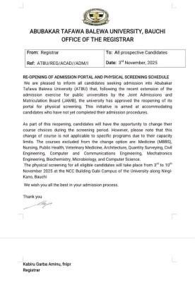 In a major update that brings relief to many prospective undergraduates, Abubakar Tafawa Balewa University (ATBU), Bauchi, has officially reopened its admission portal for the 2025/2026 academic session. This development follows the recent extension of the national admission exercise by the Joint Admissions and Matriculation Board (JAMB), a move that aims to accommodate additional applicants who may have missed earlier deadlines or are still processing admission requirements.