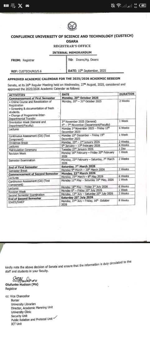 The Confluence University of Science and Technology (CUSTECH), Osara, has officially released its approved academic calendar for the 2025/2026 academic session, following approval by the university’s Senate during its 26th Regular Meeting held on Wednesday, August 27, 2025. This announcement brings clarity to students, parents, and staff who have been eagerly waiting to know how the new academic year will unfold.