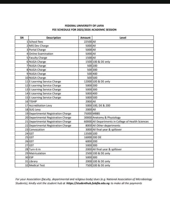 The management of the Federal University of Lafia (FULAFIA) has officially published the approved schedule of fees for all categories of students for the 2025/2026 academic session. This announcement brings much-needed clarity to both returning and newly admitted students who have been anticipating the official figures ahead of school resumption.