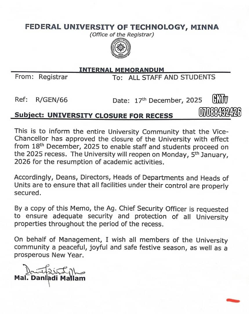 According to the memo, the Vice-Chancellor approved the closure of the university with effect from Thursday, December 18, 2025. The move is aimed at enabling both staff and students to proceed on recess in an orderly and safe manner.