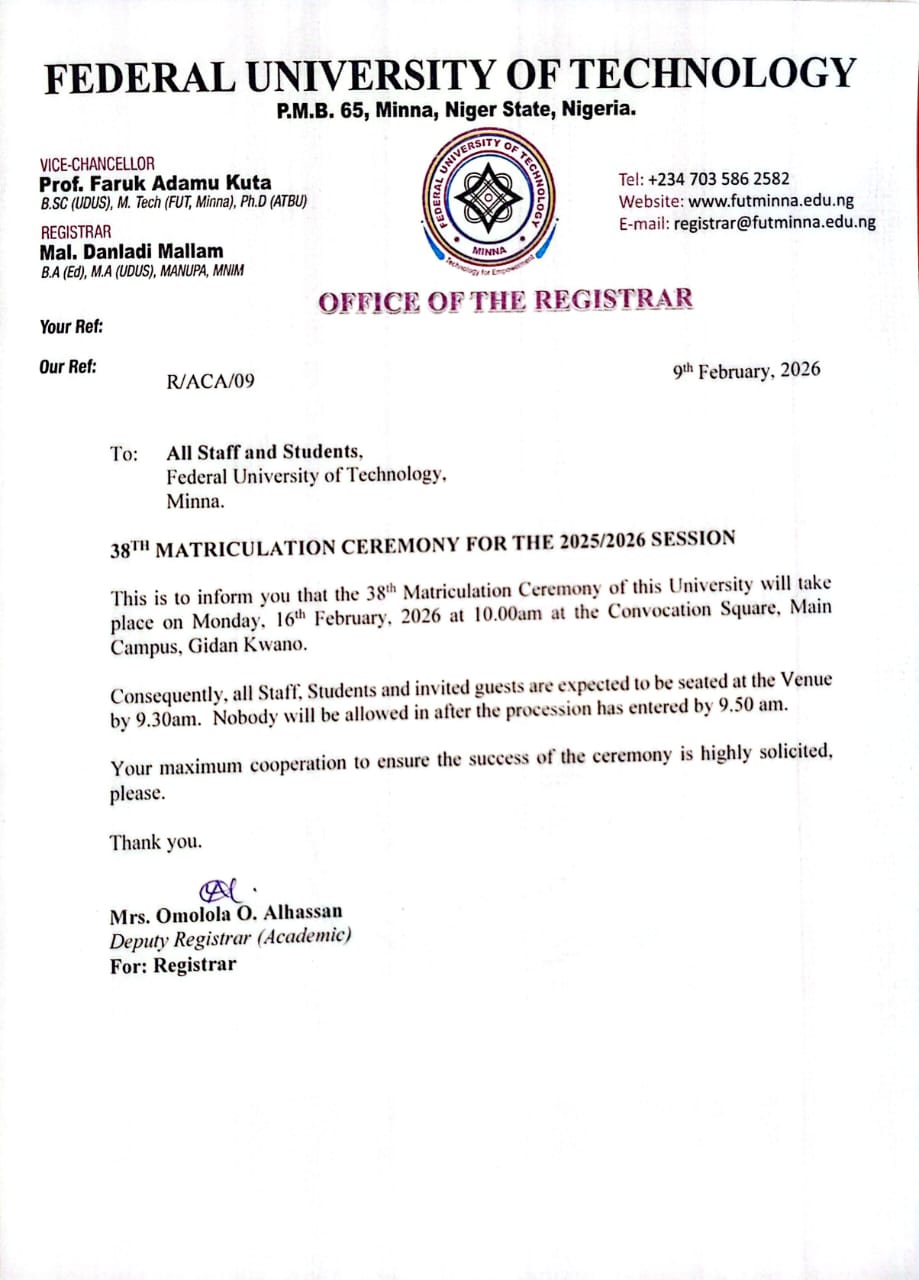 The Federal University of Technology, Minna (FUTMINNA) has officially announced the date and arrangements for its 38th Matriculation Ceremony for the 2025/2026 academic session, with the university management emphasizing punctuality and strict adherence to entry protocols for all attendees.