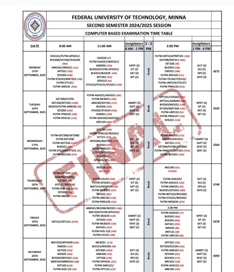 The Federal University of Technology, Minna (FUTMINNA) has officially released the timetable for the second semester examinations of the 2024/2025 academic session, and all students are expected to take note of the dates, modalities, and important guidelines.