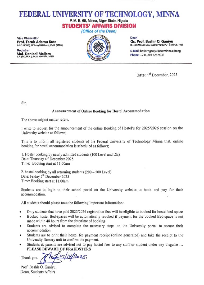 The Federal University of Technology, Minna (FUTMINNA) has officially announced the commencement dates and procedures for the 2025/2026 online hostel accommodation booking. The detailed announcement, released by the Office of the Dean of Students Affairs, is aimed at ensuring a smooth, transparent, and fraud-free accommodation process for all categories of students.