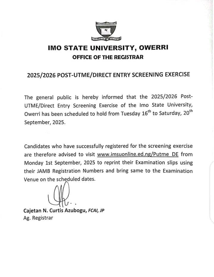 The Imo State University (IMSU), Owerri, has officially released the detailed Post-UTME and Direct Entry screening schedule for the 2025/2026 academic session. This eagerly awaited announcement marks an important phase in the university’s admission process, as thousands of candidates who applied through JAMB will now have the chance to showcase their academic ability and secure admission into one of Nigeria’s most respected institutions.