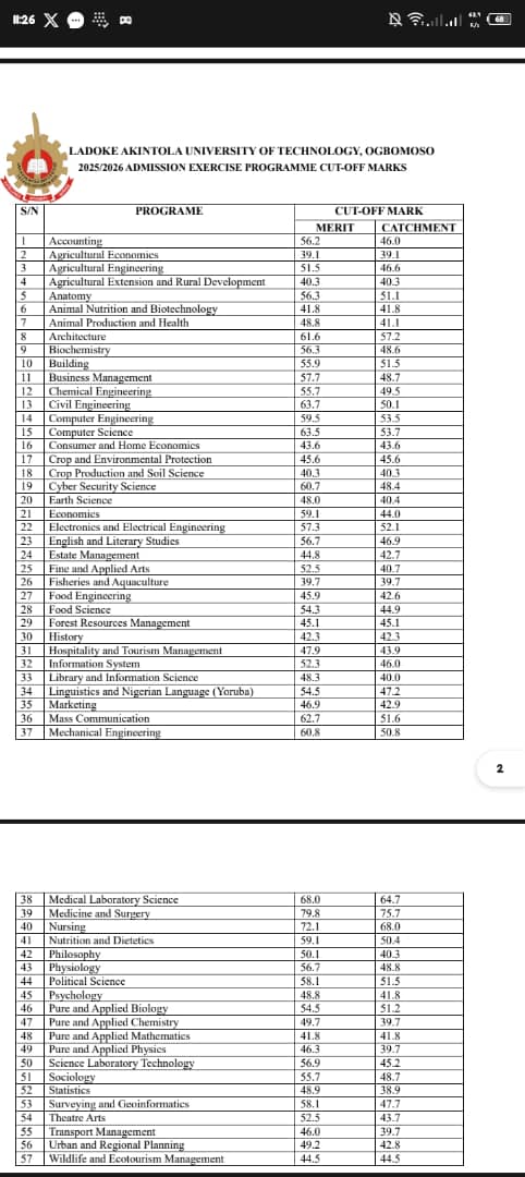 Cut-off marks are the minimum scores required for admission into a particular course or faculty. At LAUTECH, just like in many Nigerian universities, there are usually two main types of cut-off marks: