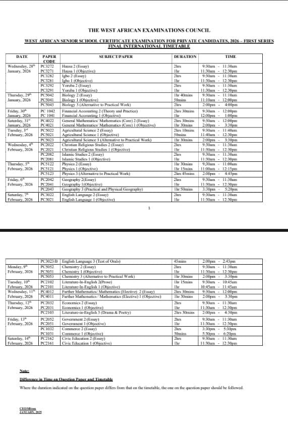 The West African Examinations Council (WAEC) has officially released the final timetable for the 2026 Common-Based West African Senior School Certificate Examination (CB‑WASSCE) for private candidates. This announcement, made on WAEC’s official X handle, comes ahead of the examination’s scheduled commencement, providing private candidates across Nigeria with the critical schedule needed to prepare effectively for one of the most important academic milestones in West African education.